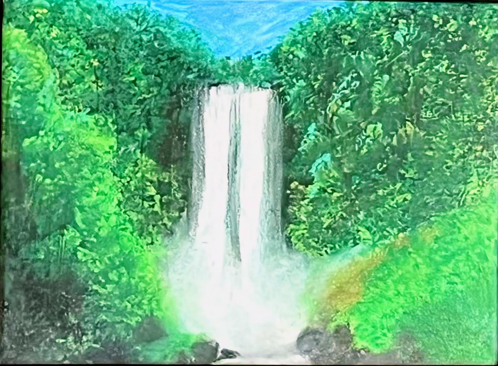 This vibrant painting depicts a majestic waterfall cascading powerfully amidst a lush, verdant landscape. The pure white columns of falling water dominate the center, appearing almost luminous against the rich, multi-toned greens of the surrounding foliage. The dense greenery on either side, rendered with varying shades of light and dark green, suggests a deep, thriving forest. A sliver of clear blue sky peeks from above, completing this serene yet dynamic natural scene. The artwork conveys the refreshing energy and sublime beauty of untouched wilderness.